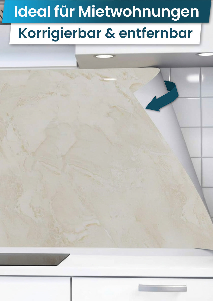 Unsere Rückwand verzichtet auf zusätzlichen Schaumstoff, der zwar die Dicke erhöht, aber beim Ablösen hartnäckig an der Wand kleben bleibt.